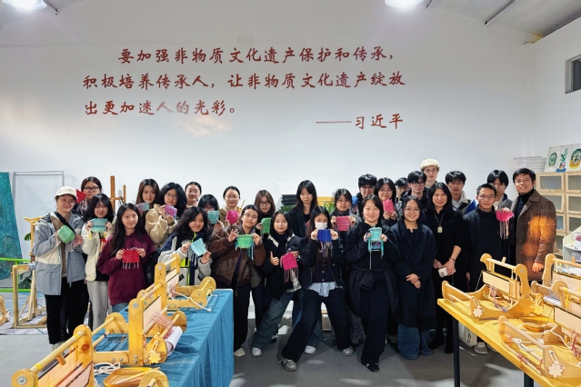 活动还注重文化反思与实践相结合。杨明老师以电影《寻梦环游记》中的文化意象为切入点,剖析墨西哥土著生命观中的循环哲学与记忆伦理。陈旦娜老师通过“多元与共荣:西班牙语的标准、变体与全球传播”讲座,介绍了泛西班牙语政策的发展。本次活动还设置“海丝遗存:松江布在世界”对谈环节,张礼骏老师与松江布馆负责人杨潘红老师共同追溯松江棉布经海上丝绸之路传播至墨西哥的历史,揭示中国纺织工艺对世界的影响。在随后的纺织工坊中,学生在杨老师指导下亲手纺织棉线杯垫,并参观丁娘子布艺馆,在实践中感受历史的温度。