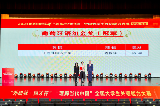 22级葡语专业硕士研究生肖以琦(中间)喜获2024“外研社·国才杯”“理解当代中国”全国大学生外语能力大赛葡语组金奖(冠军)