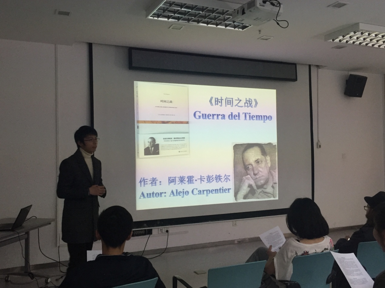 本次活动的研讨主体为古巴著名小说家阿莱霍·卡彭铁尔的经典之作——《时间之战》,主讲人为禅宗思想和语言哲学比较研究学者、上海外国语大学教师张礼骏先生。在讲座中,他首先向观众介绍了“真奇”文学概念的大致含义,随后引入“巴洛克”文学手法,并重点诠释了其与“真奇”相互协调、从而完美表现作品的途径。最后,他对书中的三个故事进行了文本和结构分析,梳理出作者具体运用巴洛克手法对时间进行“控制”与“扭曲”的线索,并与观众深入探讨了时间的主客观意义。其深入浅出的分析、妙语连珠的示例为现场观众带来了酣畅淋漓的思维体验,并启发大家开始重新审视时空与人生相关联的现实意义。