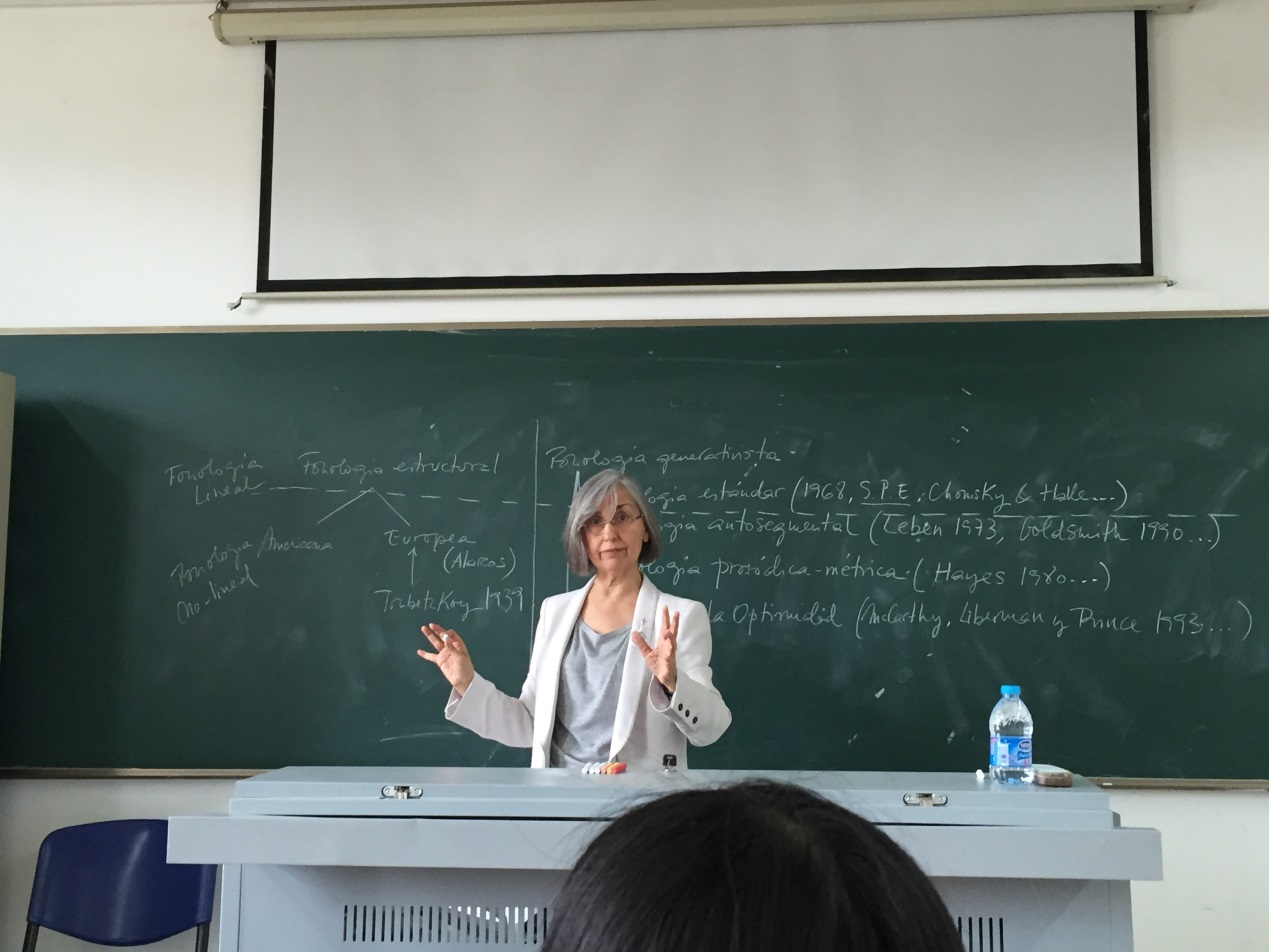 在三天的讲座中,胡安娜·希尔教授介绍了从结构主义音系学到生成音系学的转变,线性音系学和非线性音系学的差异,展示了现代音系学各个流派研究方式的差别。