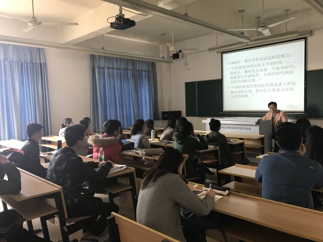 江时学研究员围绕 “中国大外交中的拉丁美洲”主题做精彩报告。第一部分是中国外交自建国初期以来发生的新变化,其中他强调了中国大外交战略可以概括为“四个布局”,多方面发展已经成为中国外交的重要特点之一。第二部分是中拉关系的发展:主要阐明了八个具体问题,包括中拉的全面战略伙伴关系的含义,中拉关系中的美国因素和“台湾问题”,如何应对拉美的“国家风险”,如何应对经贸领域中的摩擦问题,拉美左翼兴衰对中拉关系的影响,等等。其中,着重解释了“一带一路是否应该包括拉美”的问题,他认为中国和拉美一直保持良好的政策沟通,设施联通,贸易畅通、资金融通和民心相通也一直在向前推进。同学们针对“中拉命运共同体”、“拉美领导人执政能力”、“中拉金融合作”等话题提出了问题并充分沟通观点想法。