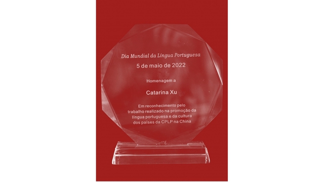 在庆祝5月5日“世界葡萄牙语日”之际,葡萄牙驻华大使杜傲杰代表葡萄牙、巴西、安哥拉等葡语国家驻华大使馆,向上海外国语大学葡语专业负责人徐亦行颁发水晶奖牌,以表彰其在葡萄牙文学的翻译和研究领域做出的贡献。