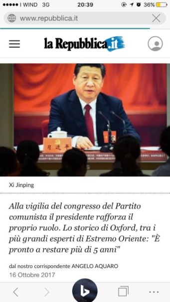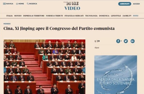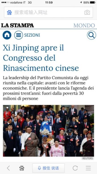 意大利有包括《共和国报》 、 《24小时太阳报》在内等四家主流媒体报纸报道了十九大,重点关注了中国的经济发展战略、与国际经济合作的前景以及中国政治体制的改革进程。作为海外党员我为祖国的繁荣强盛感到自豪,对祖国的国际地位日益提高感到骄傲。身在海外依然能感受到十九大的重大影响,证明了中国的国际影响力和大国形象。我也将会持续关注十九大以及其他国家大事,身虽在外,心系祖国。