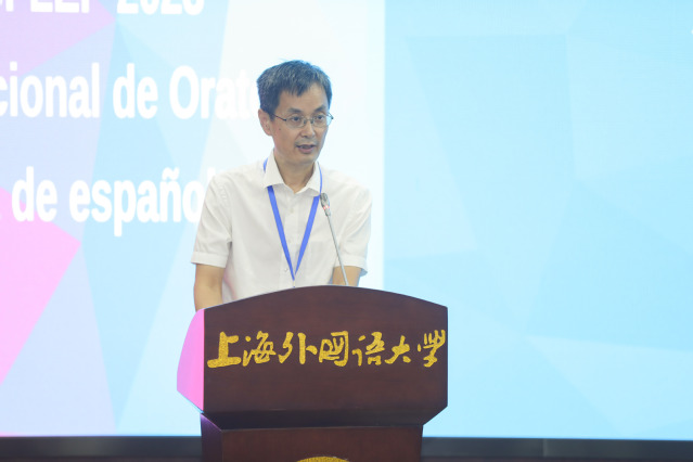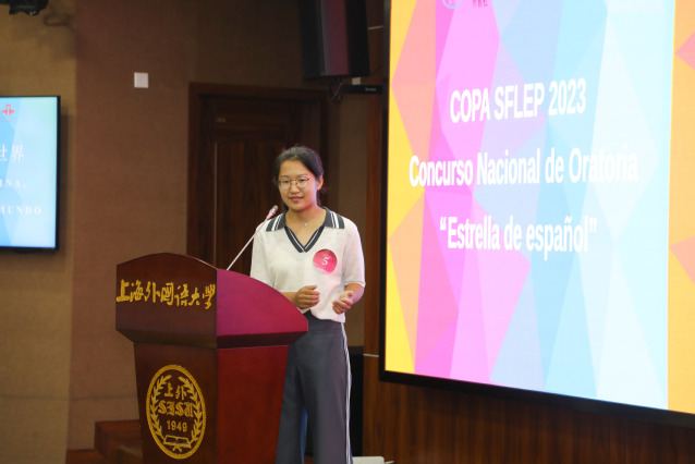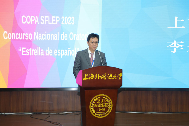 2023年9月15日,2023年外教社杯“讲述中国,联结世界”全国西班牙语之星演讲大赛决赛在上海外国语大学松江校区落下帷幕。上海外国语大学校长李岩松、西班牙皇家学院前院长Darío Villanueva院士、西班牙驻沪总领馆总领事Luis A. Calvo Castaño先生及夫人María José Carrasco女士、秘鲁驻沪总领馆总领事David Guillermo Gamarra Silva先生、古巴驻沪总领馆总领事Mileidy Aguirre Diaz女士、桑坦德咨询(北京)有限公司执行董事汤懿敏、上海塞万提斯图书馆馆长Inma González Puy女士及学术部主任Alberto Sánchez先生、北京外国语大学西班牙语葡萄牙语学院院长常福良教授、上海外语教育出版社社长孙玉、上外教务处、教材处处长、国际教育学院院长金慧教授、上海外国语大学西方语系系主任于漫教授、西方语系党委书记施海倩以及来自全国各高校西语专业的师生代表参与观赛。