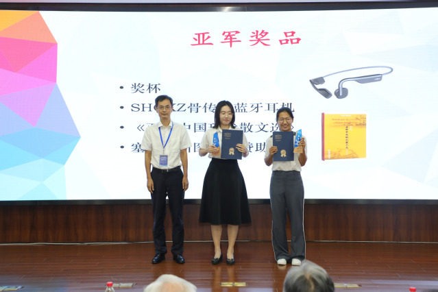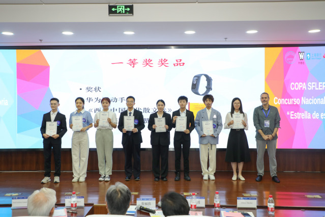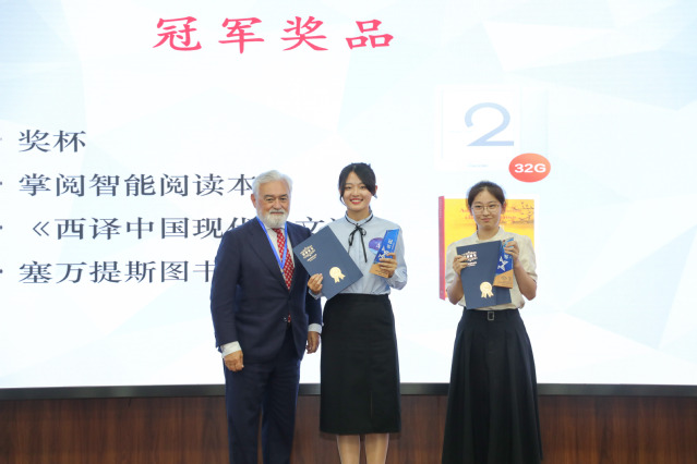 全国78所院校的866名选手报名参加本次大赛。经过初赛的激烈角逐,低年级组12名选手和高年级组12名选手入围决赛。决赛阶段由西班牙皇家学院前院长Darío Villanueva院士、西班牙驻沪总领馆总领事Luis A. Calvo Castaño先生、秘鲁驻沪总领馆总领事David Guillermo Camarra Silva先生、古巴驻沪总领馆总领事Mileidy Aguirre Diaz女士、教育部高等学校外国语言文学类专业教学指导委员会西班牙语专业教学指导分委员会主任委员、北京外国语大学西葡语学院院长常福良教授、教育部高等学校外国语言文学类专业教学指导委员会西班牙语专业教学指导分委员会副主任委员、上海外国语大学西方语系系主任于漫教授以及上海塞万提斯图书馆学术部主任Alberto Sánchez先生担任评委。低年级组选手们在决赛中就“中国青年力量”进行命题演讲并现场回答评委提问,展现出卓越的西班牙语水平和演讲才华。高年级组的竞争则更为激烈,经过第一轮命题演讲环节,八位选手成功晋级第二轮,就讲述中国故事“使用归化还是异化策略”以及“突出名人事迹,还是强调身边故事”等话题展开一对一辩论,最终四位选手脱颖而出,进入第三轮,通过观看短视频后的即兴演讲,展现出出色的临场应变能力。选手们在赛场上的精彩表现不时赢得观众的阵阵喝彩和掌声。