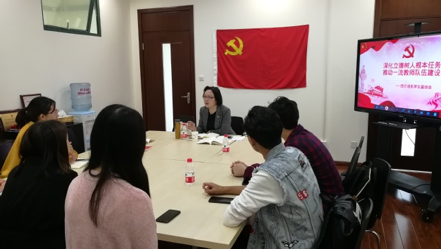 20191015日中午,西方语系在松江校区3400室举行“不忘初心,牢记使命”主题教育集中研讨学习。本次集中学习围绕深化立德树人根本任务,推动一流教师队伍建设主题展开,上海外国语大学副校长张静与西方语系党政班子全体成员共同参与学习。