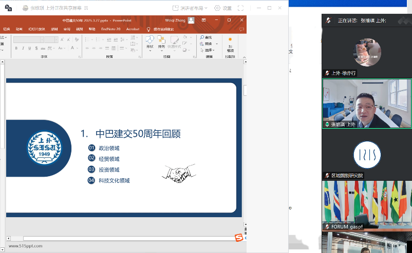应对外经济贸易大学区域国别研究院中国葡语国家研究中心邀请,2025327日上午,上海外国语大学葡萄牙研究中心主任徐亦行教授、巴西研究中心主任张维琪副教授参加了“《葡语国家发展报告(2023)》发布会暨葡语国家发展和中国与葡语国家合作回顾与展望”研讨会。
